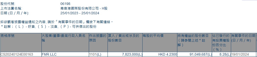 智通财经APP获悉,香港联交所最新资料显示,1月19日,FMR LLC增持青岛港(06198)782.3万股,每股作价4.23港元,总金额约为3309.13万港元。增持后最新持股数目约为9104.97万股,最新持股比例为8.28%。
