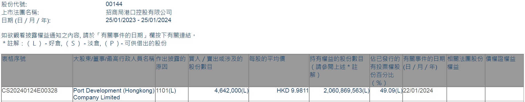 智通财经APP获悉,香港联交所最新资料显示,1月22日,Port Development (Hongkong) Company Limited增持招商局港口(00144)464.2万股,每股作价9.9811港元,总金额约为4633.23万港元。增持后最新持股数目约为20.61亿股,最新持股比例为49.09%。