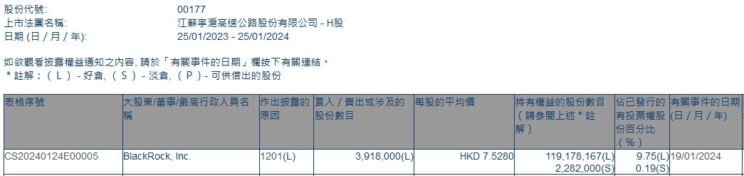 智通财经APP获悉,香港联交所最新资料显示,1月19日,贝莱德减持江苏宁沪高速公路(00177)391.8万股,每股作价7.528港元,总金额约为2949.47万港元。减持后最新持股数目约为1.19亿股,最新持股比例为9.75%。