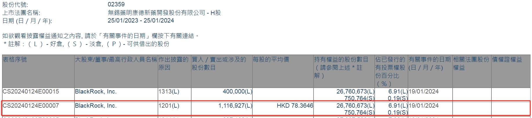 智通财经APP获悉,香港联交所最新资料显示,1月19日,贝莱德减持药明康德(02359)111.6927万股,每股作价78.3646港元,总金额约为8752.75万港元。减持后最新持股数目约为2676.07万股,最新持股比例为6.91%。