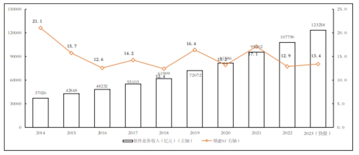 软件业务收入高速增长。2023年,全国软件和信息技术服务业规模以上企业超3.8万家,累计完成软件业务收入123258亿元,同比增长13.4%,增速较上年同期提高2.2个百分点。