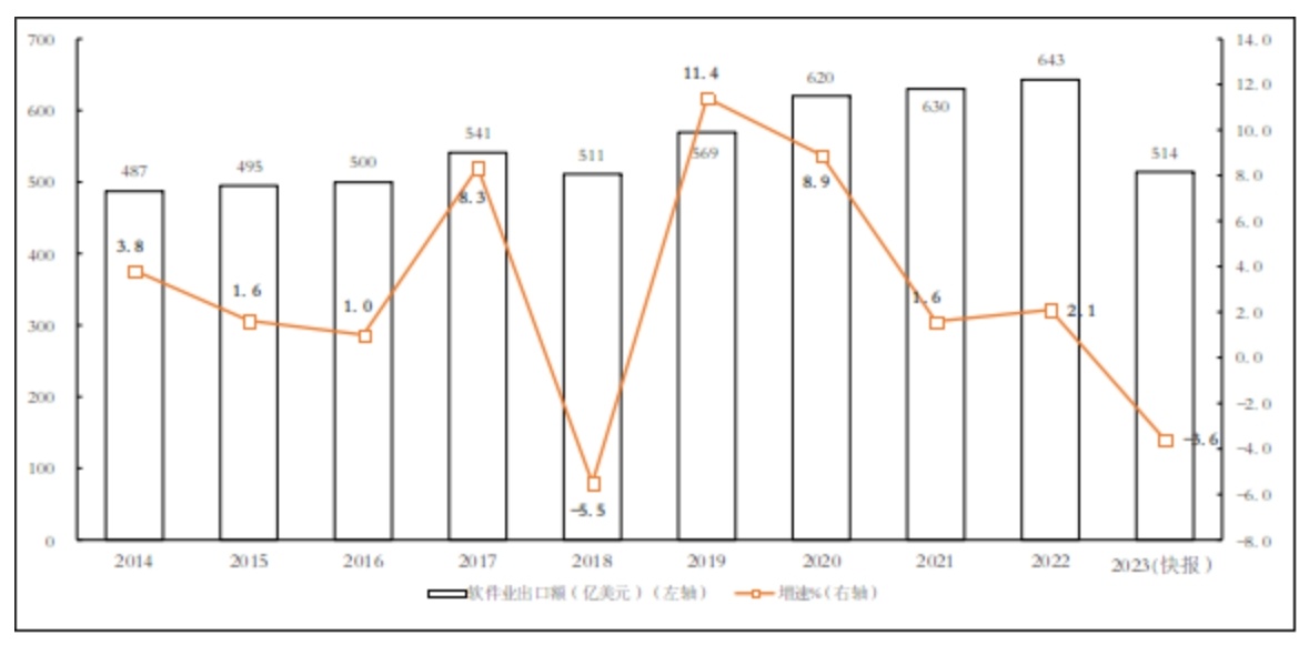 软件业务出口小幅下滑。2023年,软件业务出口514.2亿美元,同比下降3.6%。其中,软件外包服务出口同比增长5.4%。
