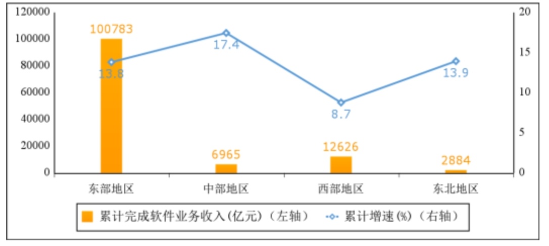 东部、东北地区保持较快增长,中部地区增势突出。2023年,东部、中部、西部和东北地区分别完成软件业务收入100783亿元、6965亿元、12626亿元和2884亿元,分别同比增长13.8%、17.4%、8.7%和13.9%。其中,东部、中部、东北部地区高出全国平均水平0.4、4.0、0.5个百分点。四个地区软件业务收入在全国总收入中的占比分别为81.8%、5.7%、10.2%和2.3%。