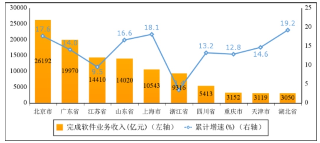 主要软件大省收入占比小幅提高,部分中西部省市增速亮眼。2023年,软件业务收入居前5名的北京、广东、江苏、山东、上海共完成收入85135亿元,占全国软件业比重的69.1%,占比较上年同期提高1.1个百分点。软件业务收入增速高于全国整体水平的省市有13个,其中增速高于20%的省份集中在中西部地区,包括内蒙古、安徽、青海等。