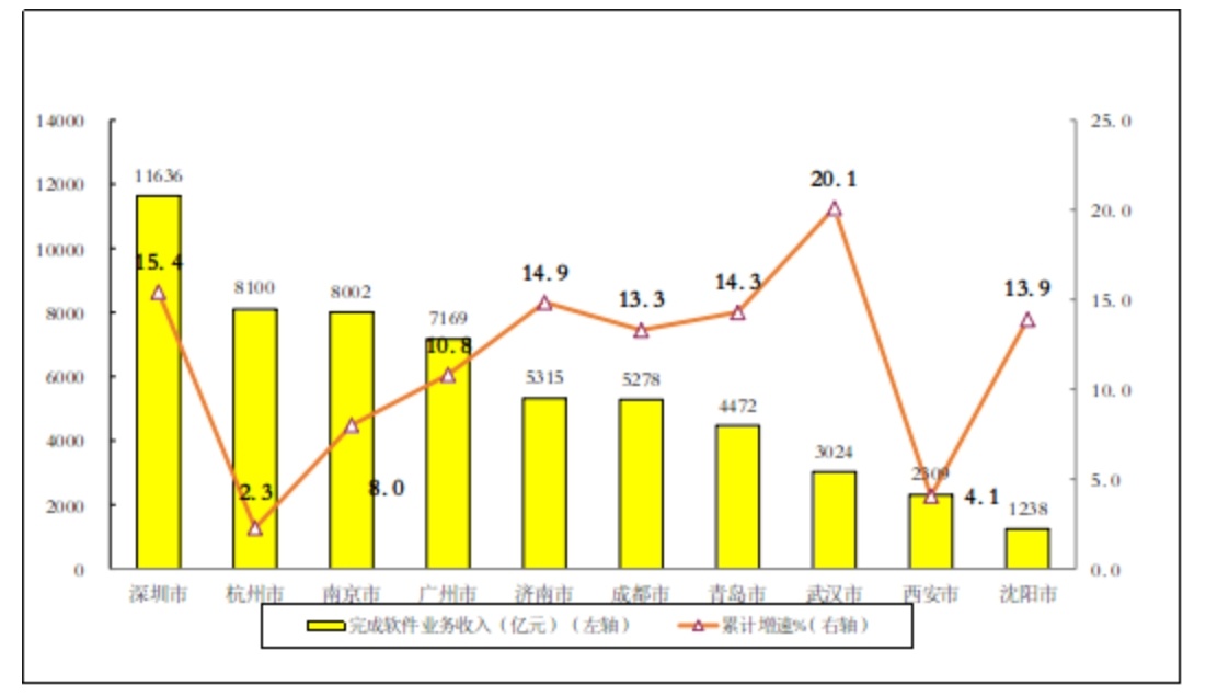 中心城市软件业务收入稳步增长,利润总额增速大幅提高。2023年,全国15个副省级中心城市实现软件业务收入59604亿元,同比增长11.2%,增速较上年同期提高1.2个百分点,占全国软件业的比重为48.4%;实现利润总额7936亿元,同比增长15.6%,增速较上年同期提高13.2个百分点。其中,哈尔滨、武汉、大连、深圳、济南、青岛、厦门和沈阳软件业务收入同比增速超过全行业整体水平。