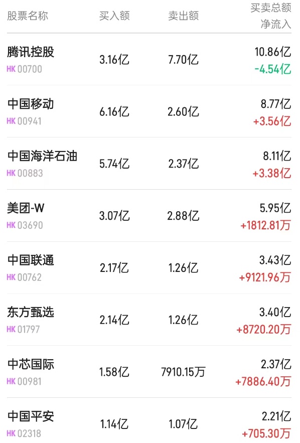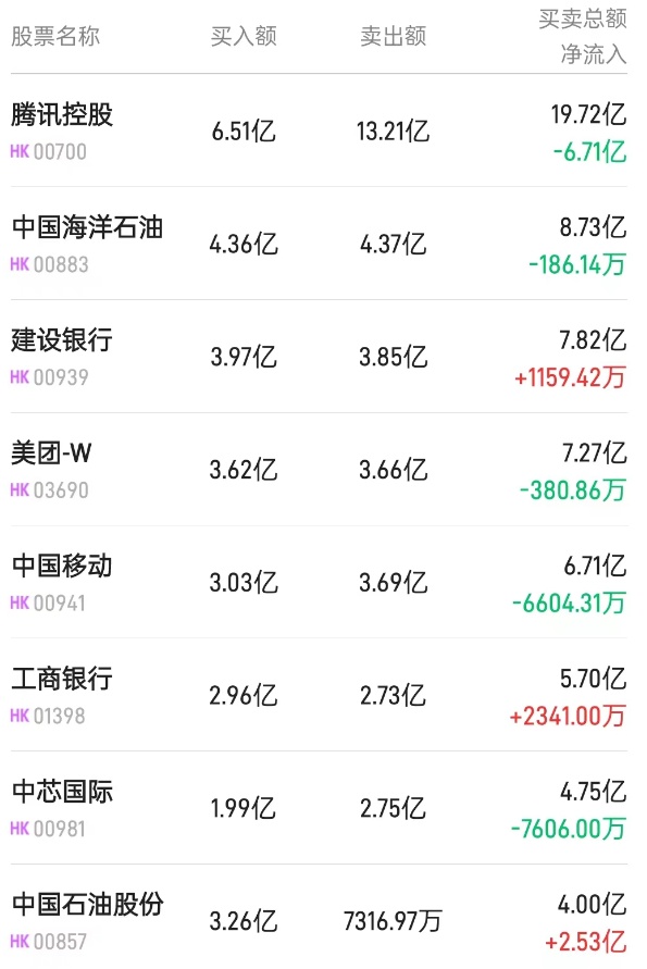 北水净买入最多的个股是中海油(00883)、中国移动(00941)、中石油(00857)。北水净卖出最多的个股是腾讯(00700)。
