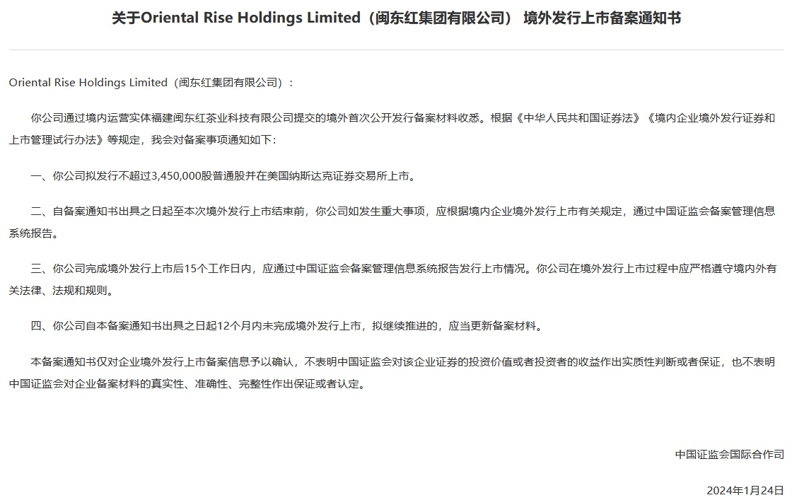 智通财经APP获悉,1月25日,中国证监会国际合作部发布关于Oriental Rise Holdings Limited(闽东红集团有限公司)境外发行上市备案通知书,该公司拟发行不超过345万股普通股并在美国纳斯达克证券交易所上市。