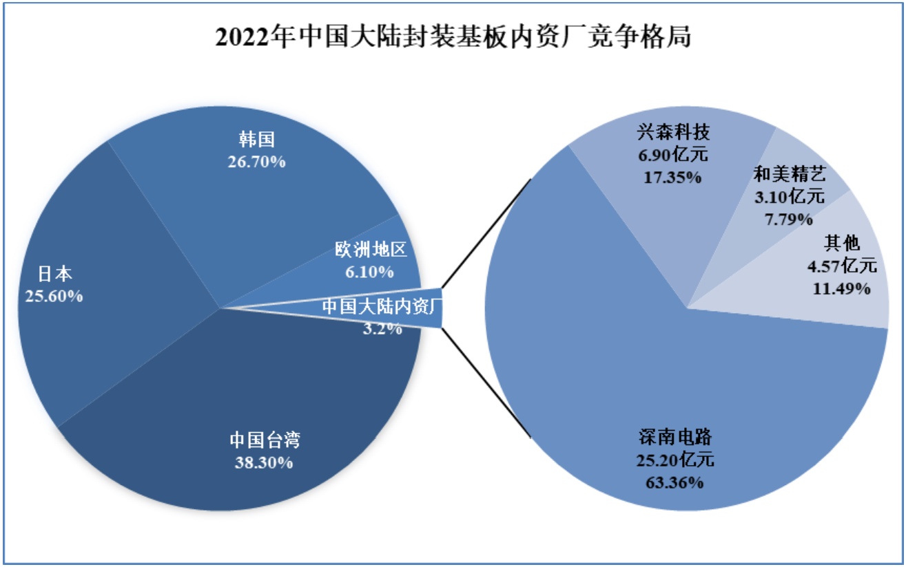 根据中国台湾电路板协会和Prismark统计,2022年全球IC封装基板产值为178.40亿美元,其中,中国大陆市场IC封装基板行业(含外资厂商在大陆工厂)整体产值规模为34.98亿美元,外资厂商产值约29.27亿美元(83.68%),内资厂商产值约5.71亿美元(16.32%)。