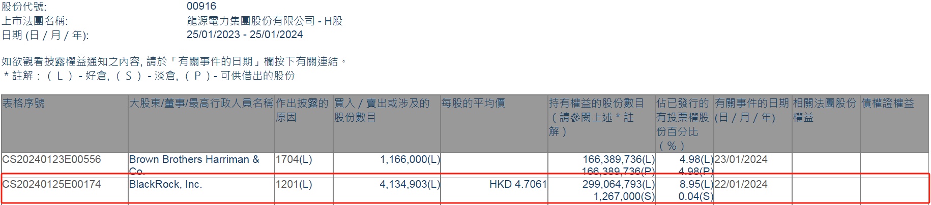 智通财经APP获悉,香港联交所最新资料显示,1月22日,贝莱德减持龙源电力(00916)413.4903万股,每股作价4.7061港元,总金额约为1945.93万港元。减持后最新持股数目约为2.99亿股,最新持股比例为8.95%。