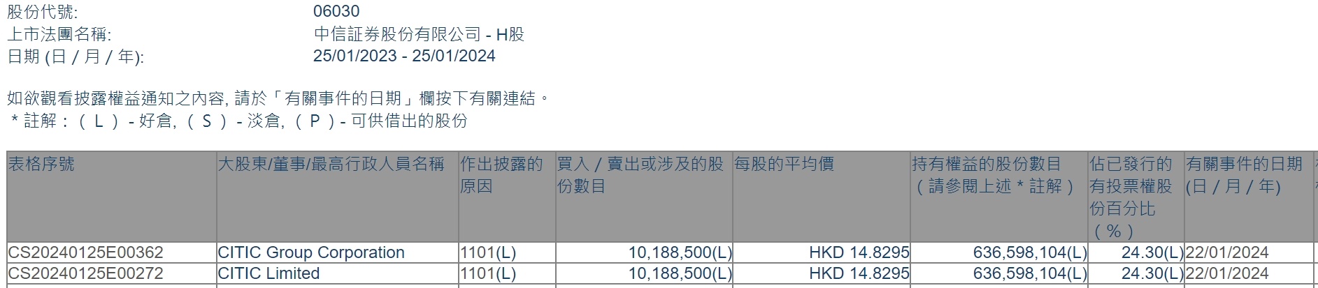 智通财经APP获悉,香港联交所最新资料显示,1月22日,CITIC Limited增持中信证券(06030)1018.85万股,每股作价14.8295港元,总金额约为1.51亿港元。增持后最新持股数目约为6.37亿股,最新持股比例为24.30%。