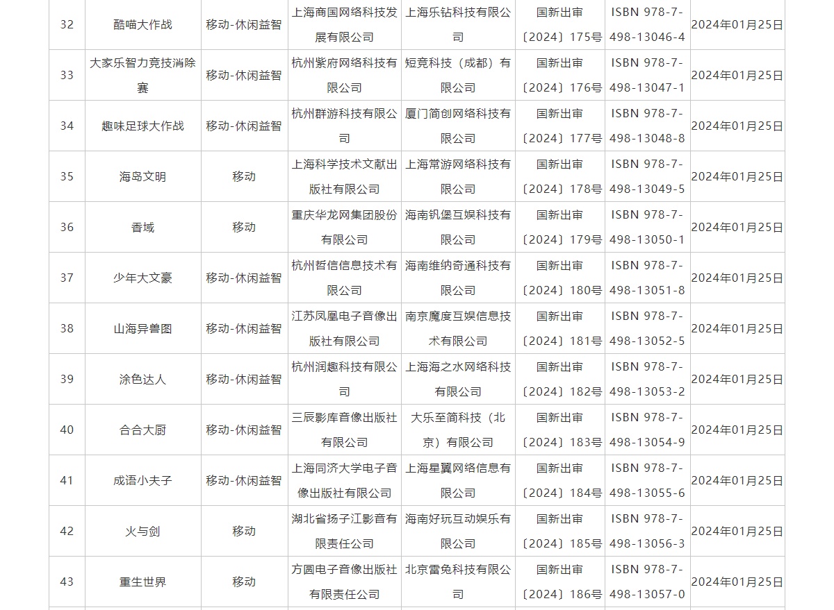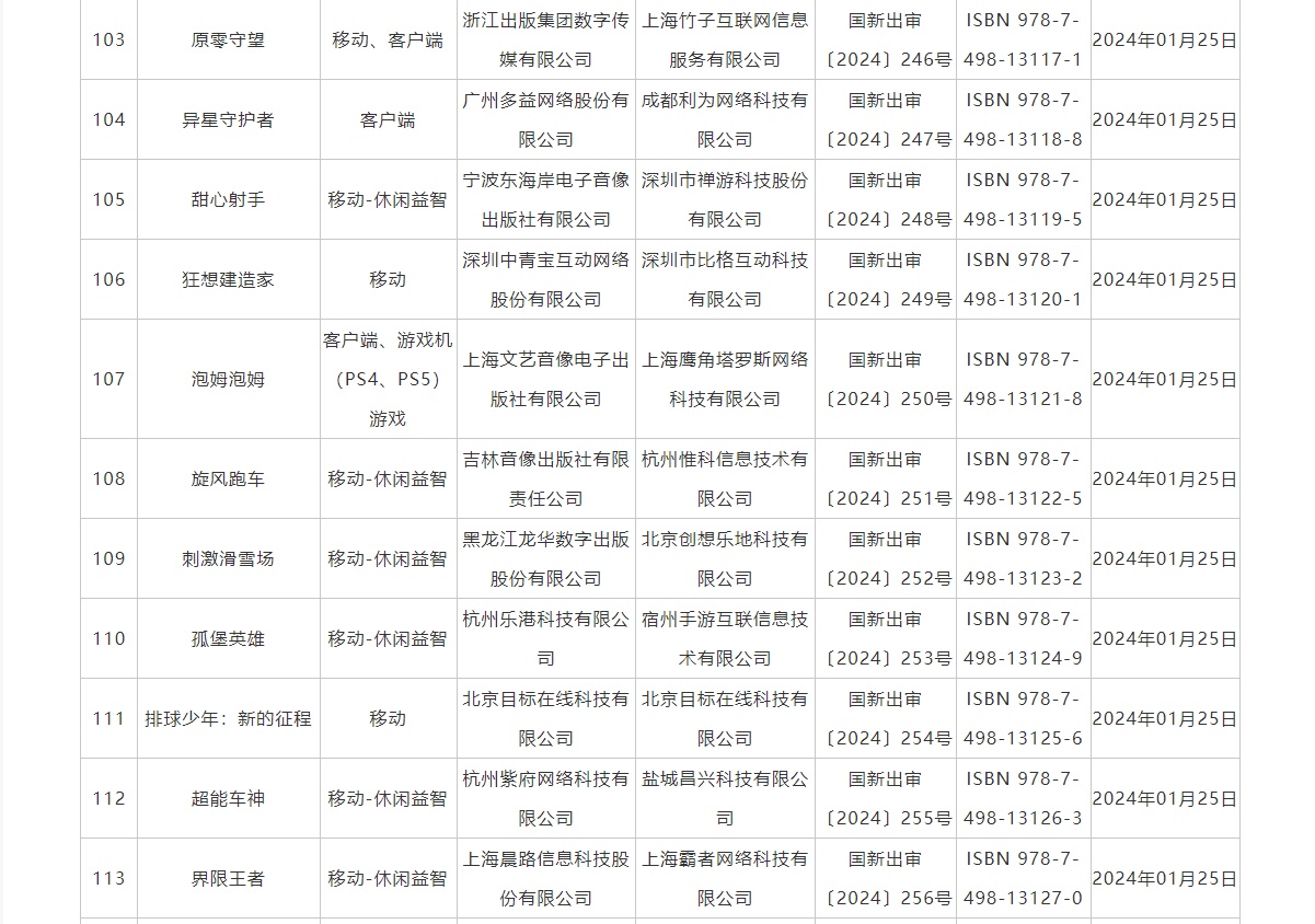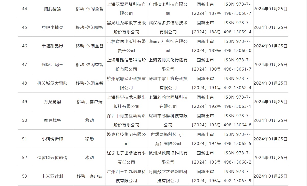 智通财经APP获悉,1月26日,国家新闻出版署发布2024年1月国产网络游戏审批信息,共115款游戏获批,其中包括腾讯(00700)旗下的《热血美职篮》、中青宝(300052.SZ)旗下的《魔导战争》、三七互娱(002555.SZ)旗下的《客人请留步》等在列。