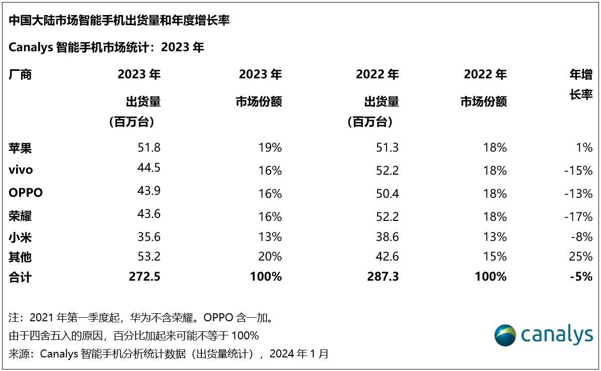 智通财经APP获悉,Canalys发文称,2023年第四季度,中国大陆手机市场跌幅进一步收窄,整体出货7390万台,同比下跌1%。其中,苹果(AAPL.US)四季度出货1750万台,位居榜首。苹果新产品供应充足,出货同比增长6%。荣耀以16%的市场份额紧随其后,位居第二,出货1170万台。vivo出货1130万台,排名上升至第三。华为出货1040万台,通过旗舰新品出货同比上升47%,回归前五榜单,排名第四。