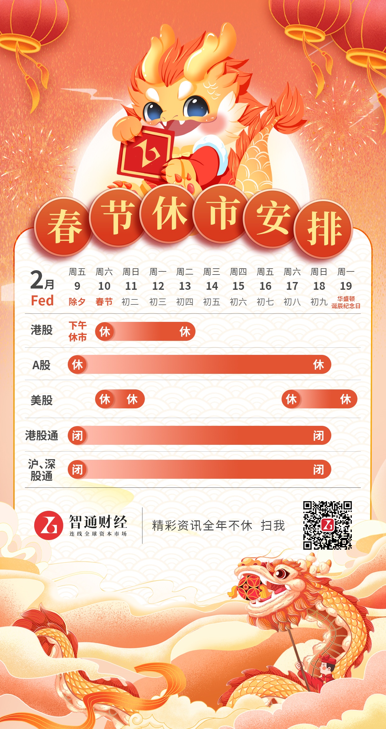 智通财经APP获悉,春节假期即将来临,港股于2月9日(星期五)除夕上午开市半天,下午起休市,2月10日(星期六)至2月13日(星期二)休市,2月14日(星期三)大年初五起照常开市。