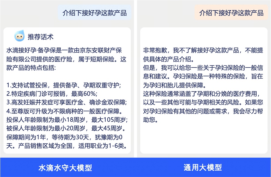 目前市面上的保险产品数量庞大,保险条款、健康告知、核保要求等也不尽相同,在回答保险产品和保险方案等保险垂直领域问题的时候,单独依靠经纪人个人力量,很难短时间内完全掌握。“帮帮”能够基于“水守大模型”的底层能力,迅速定位某款具体的保险产品。对比通用大模型相对“广泛性”的回复,“帮帮”可以为保险经纪人和用户给出更专业、准确、易于理解的建议。
