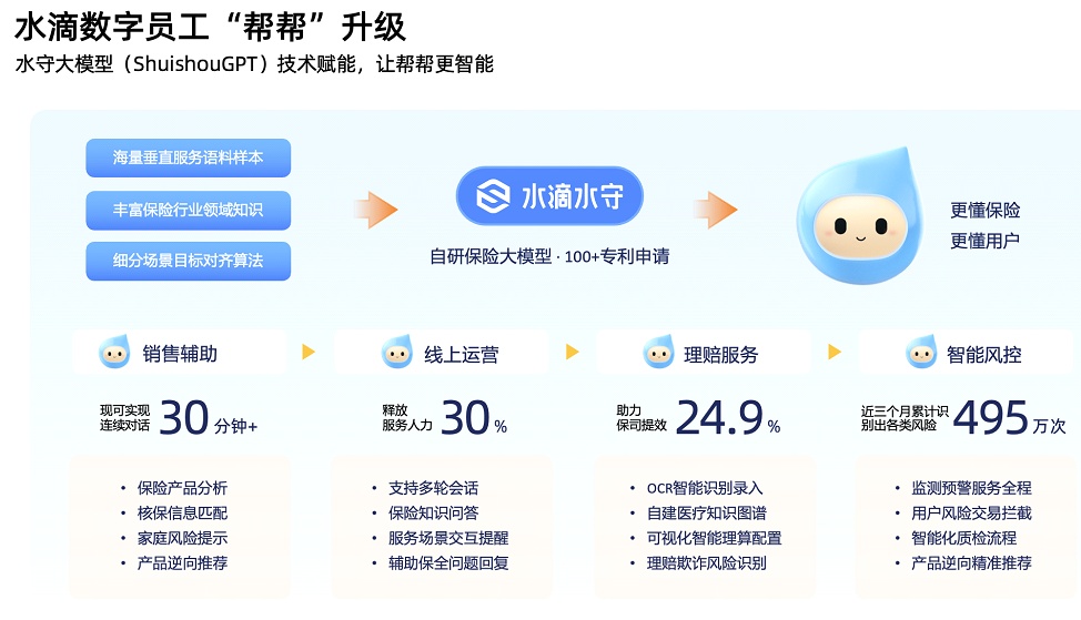 “帮帮”具有很强的自我学习和迭代能力。水滴公司AI负责人表示:“‘水守大模型’几乎每周都在迭代,我们相信,未来‘帮帮’也将逐步从‘辅助’和‘赋能’转变为更智能和主动的角色。同时,‘帮帮’也具备可对外输出能力,能够向行业合作伙伴开放。”
