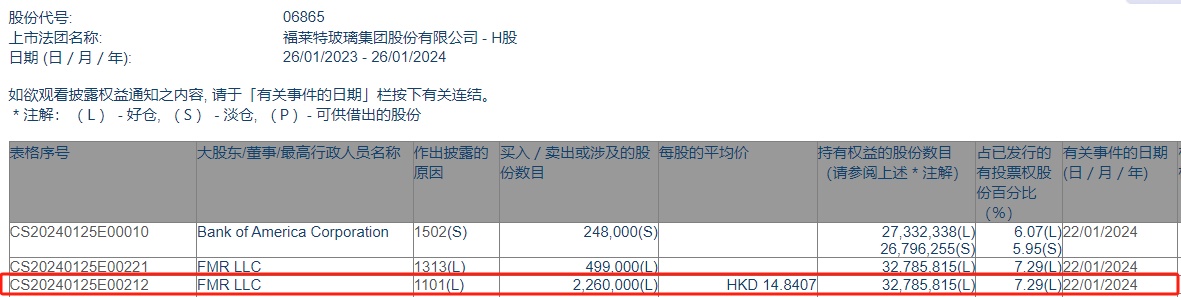 智通财经APP获悉,香港联交所最新资料显示,1月22日,FMR LLC增持福莱特玻璃(06865)226万股,每股作价14.8407港元,总金额约为3354.00万港元。增持后最新持股数目约为3278.58万股,最新持股比例为7.29%。