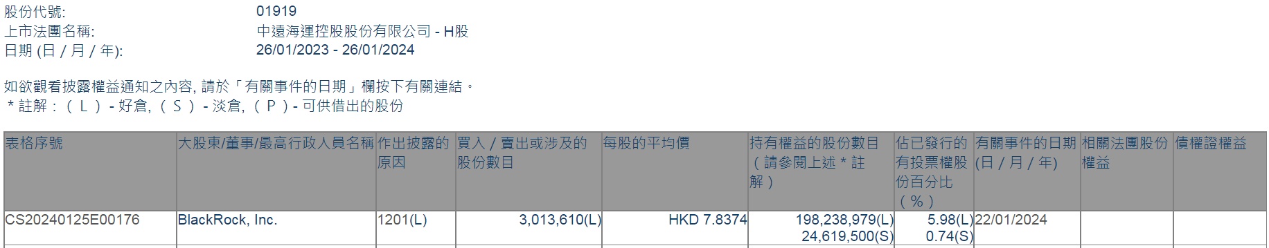 智通财经APP获悉,香港联交所最新资料显示,1月22日,贝莱德减持中远海控(01919)301.361万股,每股作价7.8374港元,总金额约为2361.89万港元。减持后最新持股数目约为1.98亿股,最新持股比例为5.98%。