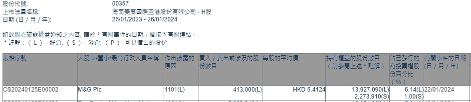 智通财经APP获悉,香港联交所最新资料显示,1月22日,M&G Plc增持美兰空港(00357)41.3万股,每股作价5.4124港元,总金额约为223.53万港元。增持后最新持股数目约为1392.71万股,最新持股比例为6.14%。