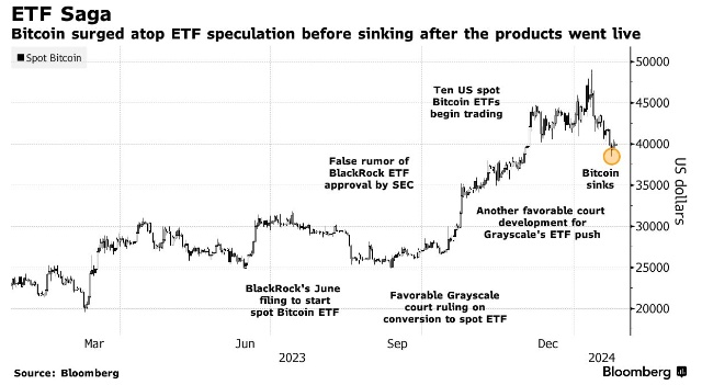 1月11日,比特币触及49,021美元的盘中高点,随后在本周早些时候跌至38,510美元的低点。在2021年大流行时期的加密货币狂热期间,它创下了近6.9万美元的历史新高。