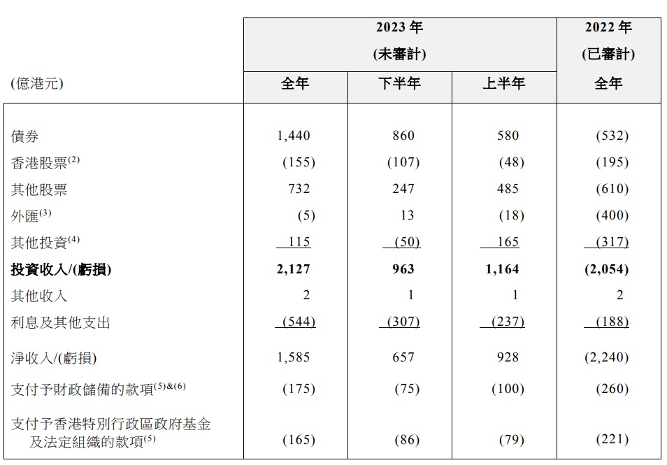 智通财经APP获悉,1月26日,香港金管局公布外汇基金截至2023年12月底未经审计的财务状况。2023年,香港外汇基金取得2127亿港元的投资收入,其主要组成部分包括:债券投资收益1440亿港元;香港股票投资亏损155亿港元;其他股票投资收益732亿港元;非港元资产外汇估值下调5亿港元;及其他投资收益115亿港元。