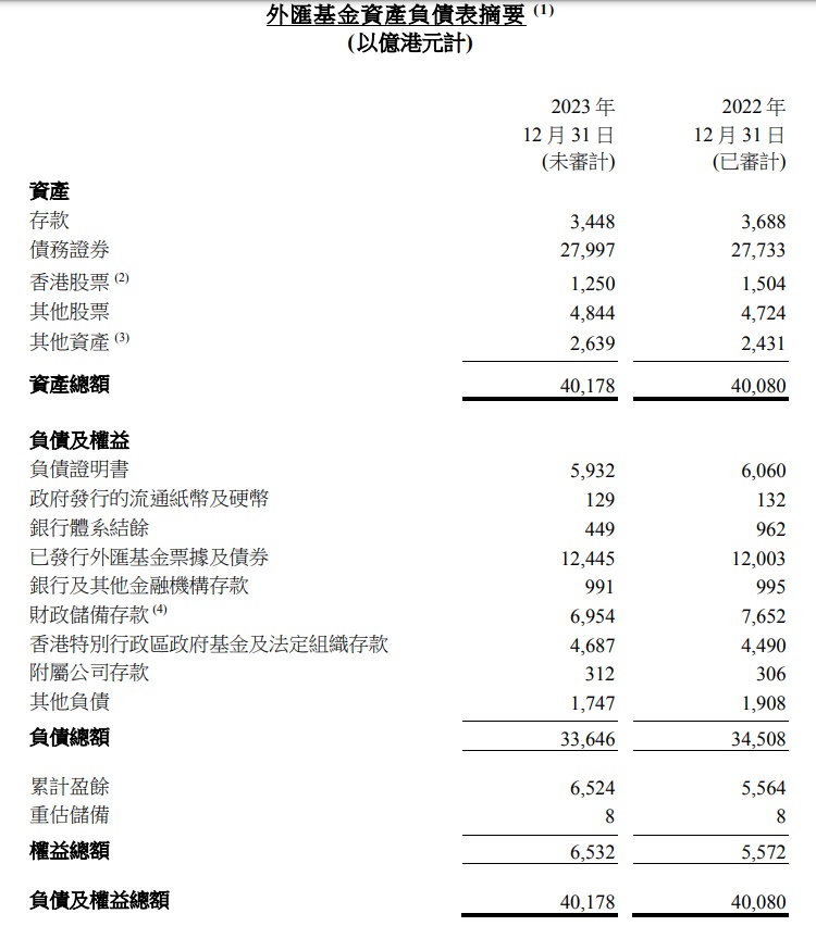 外汇基金资产负债表摘要显示,外汇基金的总资产增加98亿港元,由2022年底的40080亿港元,增加至2023年底的40178亿港元。于2023年12月底,外汇基金累计盈余为6524亿港元。