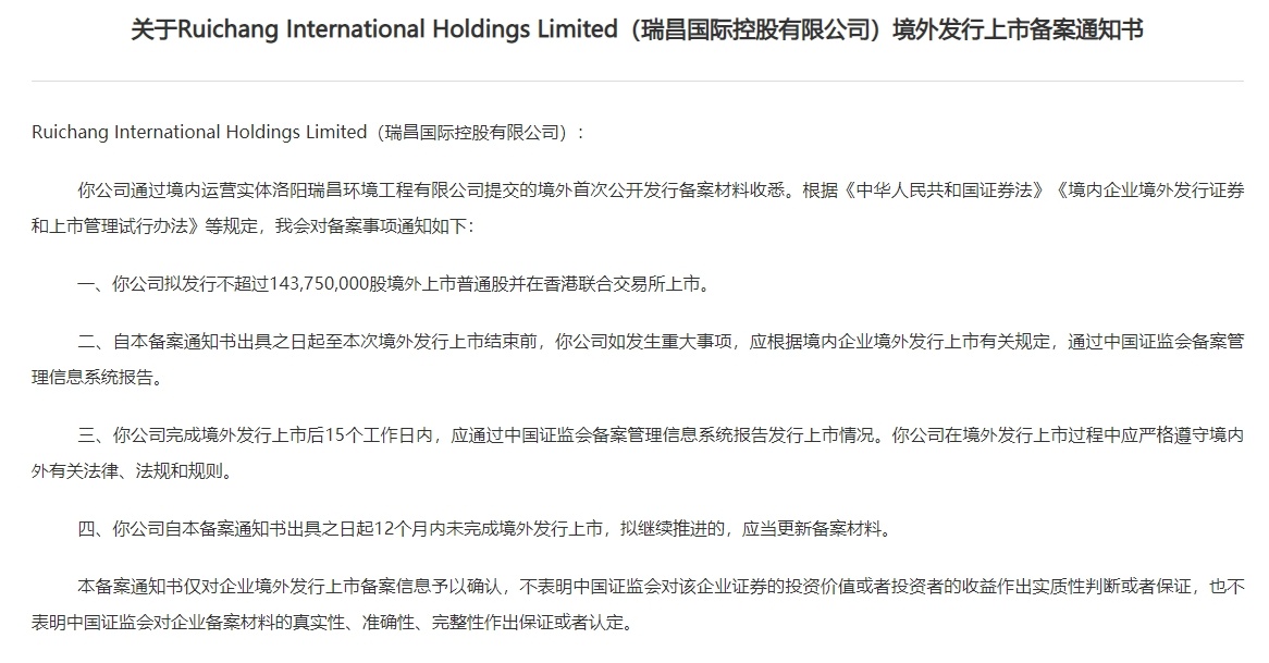 智通财经APP获悉,1月26日,中国证监会发布关于Ruichang International Holdings Limited(瑞昌国际控股有限公司)境外发行上市备案通知书,公司通过境内运营实体洛阳瑞昌环境工程有限公司提交的境外首次公开发行备案材料收悉。公司拟发行不超过1.4375亿股境外上市普通股并在香港联合交易所上市。