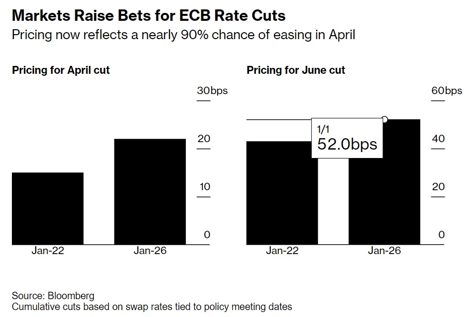 包括德意志银行、三菱UFJ金融集团和Janus Henderson Group Plc在内的越来越多的银行和资产管理公司认为,欧洲央行将在4月份首次降息。自本周开始以来,对4月份加息的押注就越来越多,当时货币市场的加息几率为60%。