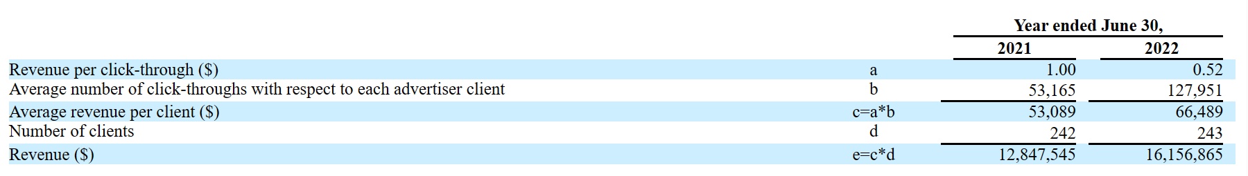 若详细拆解浩希健康的业绩数据能发现,推动公司业绩持续成长的逻辑并不相同。在2022财年中,浩希健康的客户数量为243个,较2021财年的242个保持稳定,但单次点击收入却从2021财年的1美元降至2022财年的0.52美元,直接腰斩。