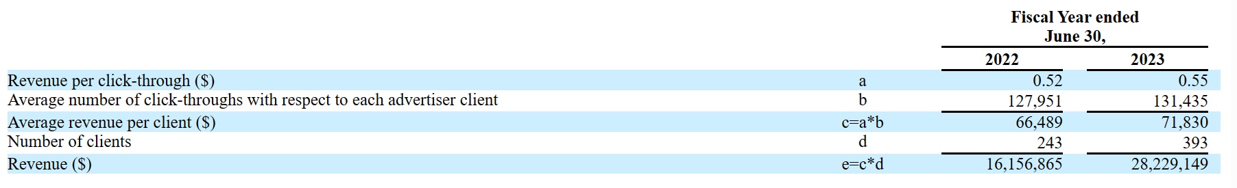 而在2023财年中,每次点击收入为0.55美元,保持稳定,每个广告客户的平均点击次数为13.14万,同比增长不到3%。而带动收入增长的主要原因是客户数量的大幅提升,从2022财年的243个大幅上升至2023财年的393个。