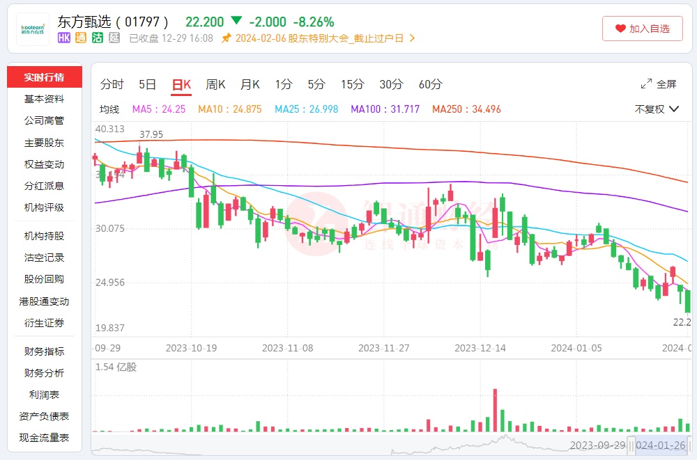 这无疑是一份令二级市场“失望”的成绩单。公布财报后,东方甄选股价接连大跌,分别于1月25日、26日下跌8.33%、8.26%。截止目前,公司股价为22.20港元,总市值为225.67亿港元。
