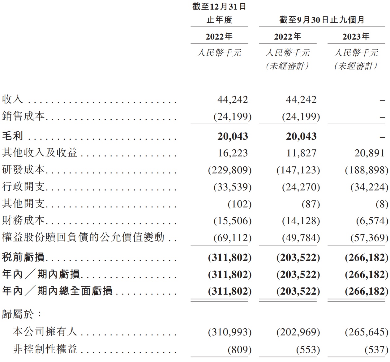 财务方面,于2022年度、2022年9月30日止九个月、2023年9月30日止九个月,公司的收入分别为人民币4424.2万元、4424.2万元、-。同期,公司的净利分别亏损3.12亿元、2.04亿元及2.66亿元人民币。