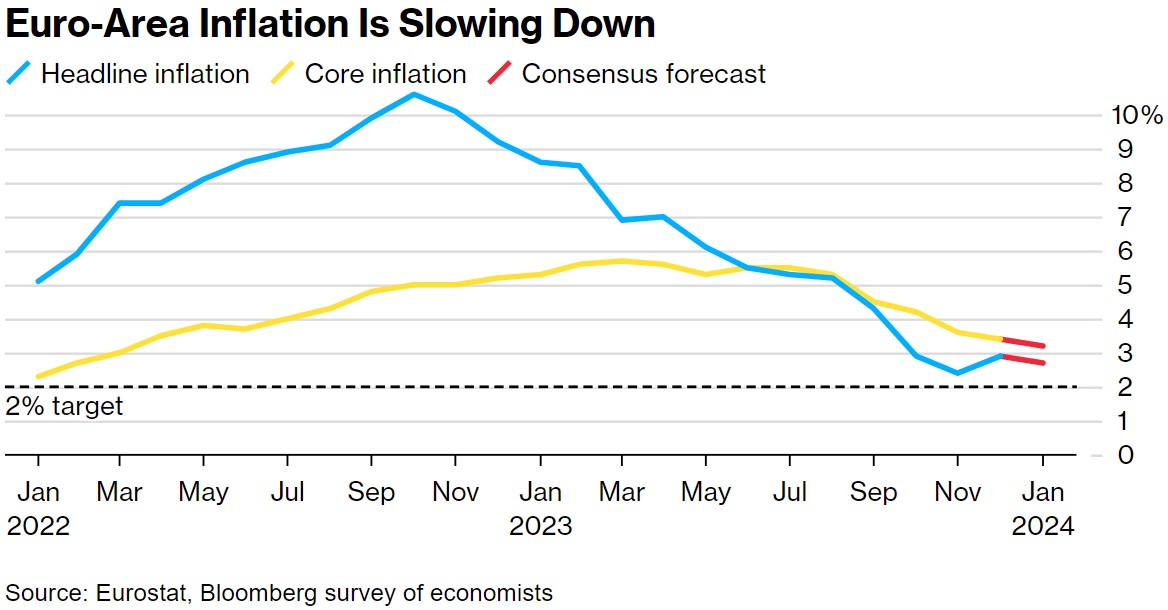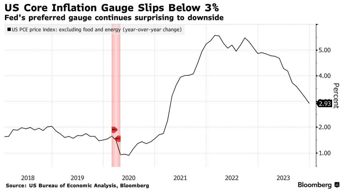 一方面,通胀数据继续出人意料地下行。上周五公布的数据显示,美联储青睐的指标12月份降至2.9%,自2021年初以来首次跌破3%。