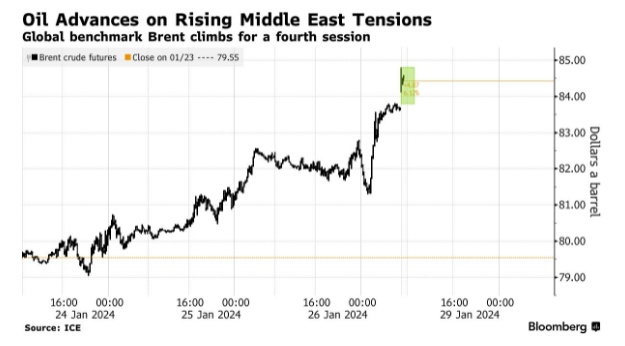 智通财经APP获悉,由于驻约旦美军士兵和红海一艘英国油轮前后分别遇袭引发了市场担忧,油价大幅上涨,这标志着对能源生产和全球贸易至关重要的中东地区紧张局势升级。