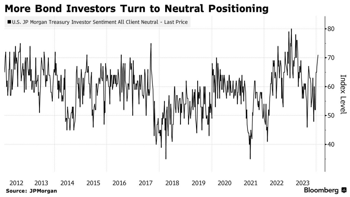 摩根大通的一项调查显示,对债市持中性态度的投资者比例升至4月以来最高,突显出市场的观望情绪。