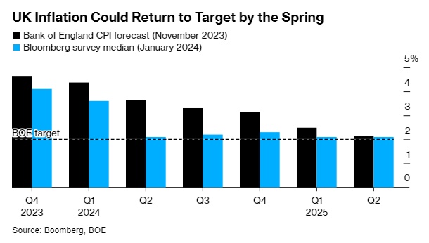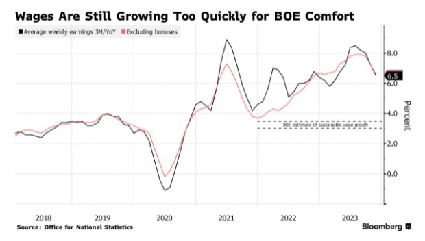 在2022年达到11.1%峰值的消费者价格涨幅目前仍达到4%的水平。而英国央行已将利率从2021年12月的0.1%上调至5.25%,以抑制通胀,市场普遍预计,该央行周四将维持利率不变。