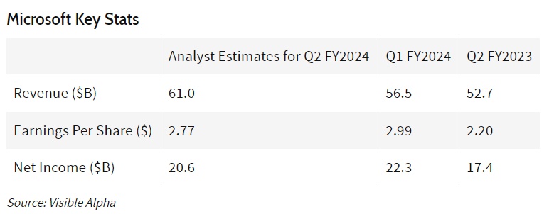 而在这期间,最重磅的财报之一无疑是全球“新晋股王”——市值刚刚击败苹果且突破3万亿美元大关的微软(MSFT.US)。微软将于美东时间1月30日美股盘后公布业绩,机构汇编的华尔街分析师预期数据显示,分析师们普遍预期微软2024财年第二季度(截至2023年12月)总营收同比增长近16%,达到约610.9亿美元,预计主要由包括Azure在内的智能云业务所驱动,随着微软在去年11月推出Microsoft 365 Copilot企业版本,“AI应用端创收效应”或将逐步揭晓答案;分析师们普遍预期微软Q2 GAAP准则下每股收益(EPS)为2.77美元,意味着可能同比增长25%。