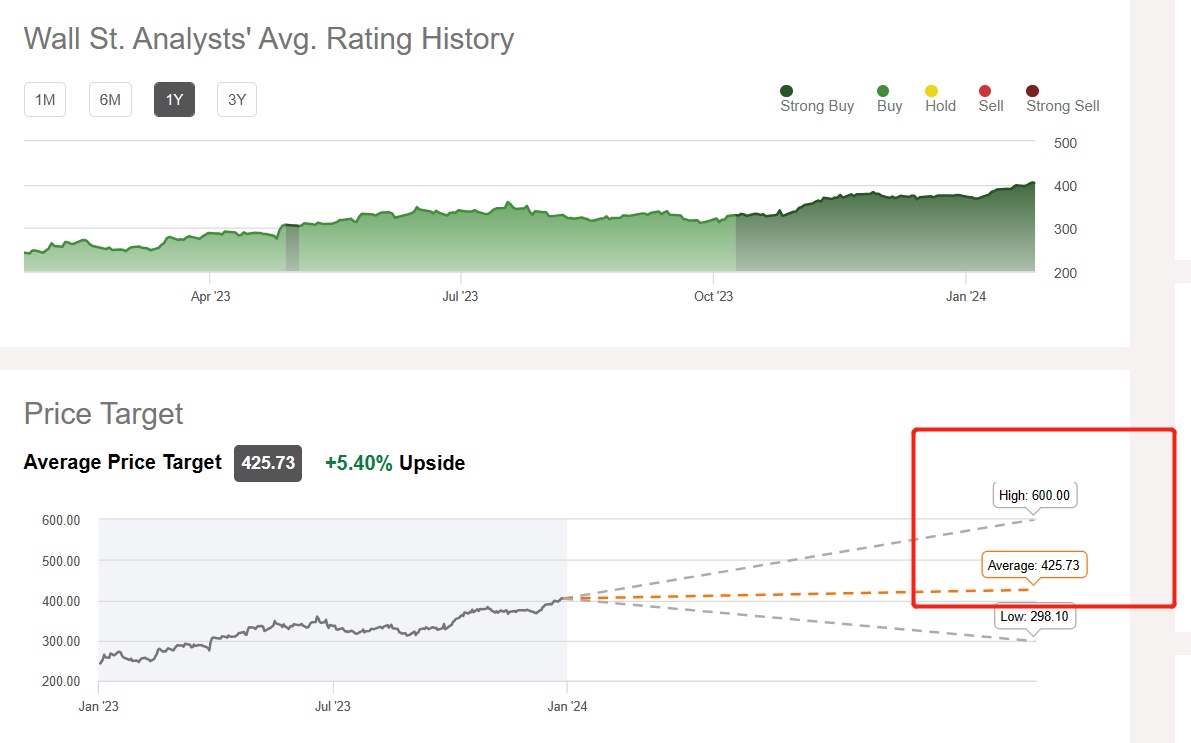 Seeking Alpha汇编的华尔街分析师共识评级以及目标价显示,华尔街分析师们对微软的共识评级为“强力买入”,平均目标价预期则高达425.73美元这一历史新高,最高达600美元。