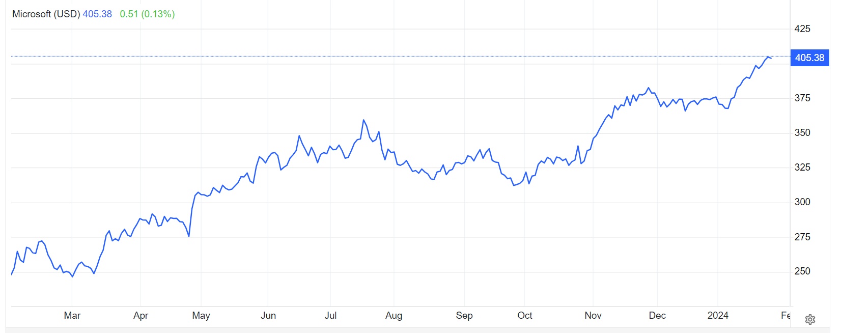 2023年,微软是美股市场炙手可热的科技股中表现最好的股票之一。截至上周五美股交易结束,微软的股价在过去一年中涨幅高达 63%,2023年全年涨幅则高达58%。