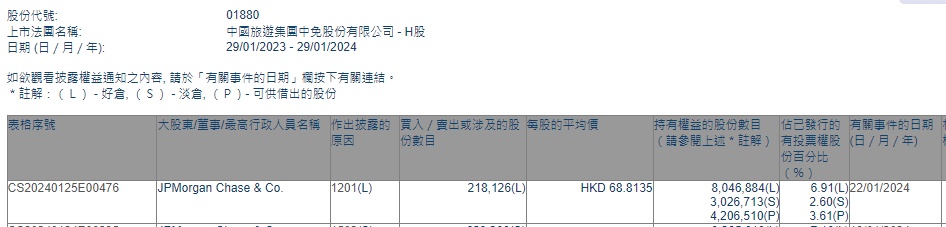 智通财经APP获悉,香港联交所最新资料显示,1月22日,小摩减持中国中免(01880)21.8126万股,每股作价68.8135港元,总金额约为1501.00万港元。减持后最新持股数目约为804.69万股,最新持股比例为6.91%。
