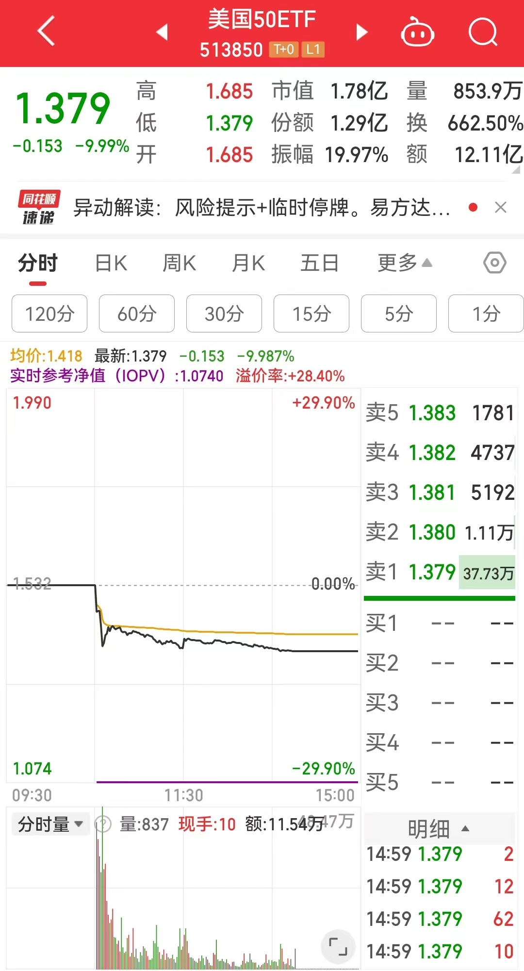 智通财经APP获悉,1月29日,美国50ETF(513850)上演“天地板”。早盘该ETF以涨停价开盘,随后迅速下行,午后封死跌停,盘中振幅达20%,溢价率超28%。