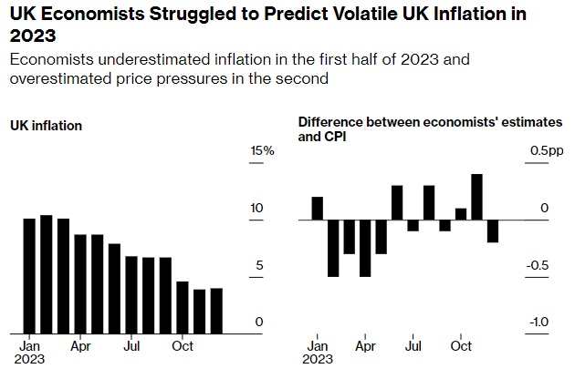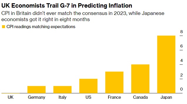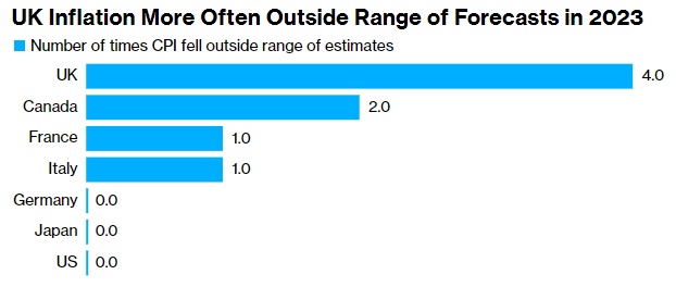 尽管近几个月来英国通胀率已缩小了与其他七国集团(G7)国家的差距,但数据的波动性仍令英国央行头疼。英国央行在正确预测价格压力势头的变化方面也遇到了困难,而这些错误可能正在影响其政策决定。在2023年上半年,它低估了高通胀的持久性,但随后在下半年明显高估了通胀压力。