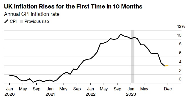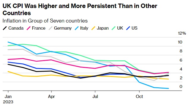 尽管CPI在2022年底达到11.1%的40年高点,此后一直在回落;几个月来,英国的通货膨胀问题是七国集团中最严重的。英国12月份CPI年率为4%,仍然是英国央行目标的两倍。而在七国集团中,英国在2023年是通胀数据与经济学家预期差距最大的国家。