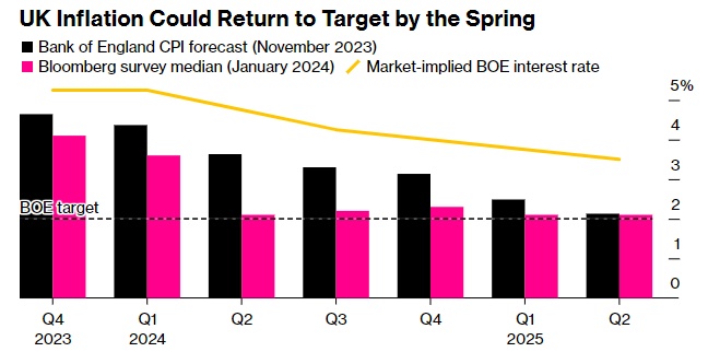 英国央行将在2月1日发布新一轮预测,分析师将仔细研究这些预测,以寻找货币政策委员会可能放松政策的迹象。根据经济学家的预测,未来几个月通胀率可能回落至英国央行2%的目标,投资者已经消化了从今年年中开始的一系列快速降息。