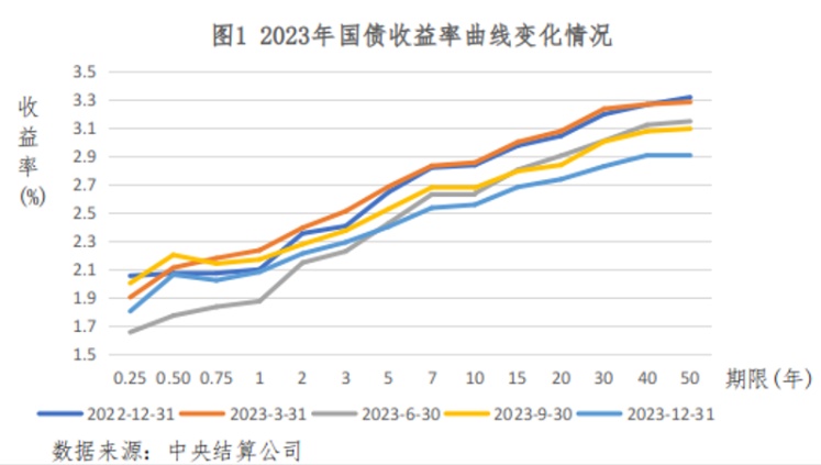 2023年末,1年、3年、5年、7年、10年期国债收益率分别为2.08%、2.29%、2.40%、2.53%、2.56%,分别较2022年末下行2个、11个、24个、29个、28个基点。2023年末,中债国债总指数收盘价为224.5,较2022年末上涨10.8;中债新综合全价指数收盘价为124.6,较2022年末上涨2.5。