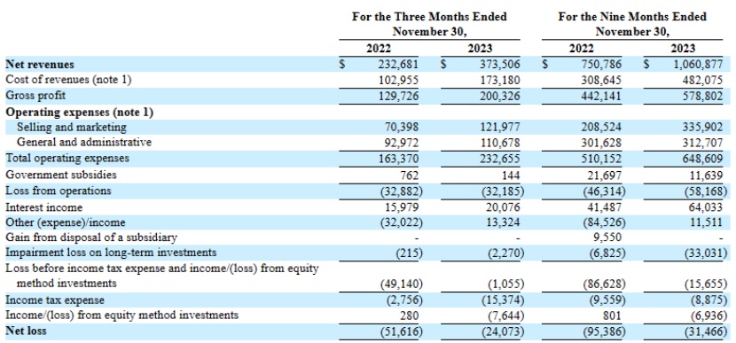 简言之,在截至2023年11月30日的3个月内,好未来实现了营收高增速以及净亏损同比收窄的向好业绩。