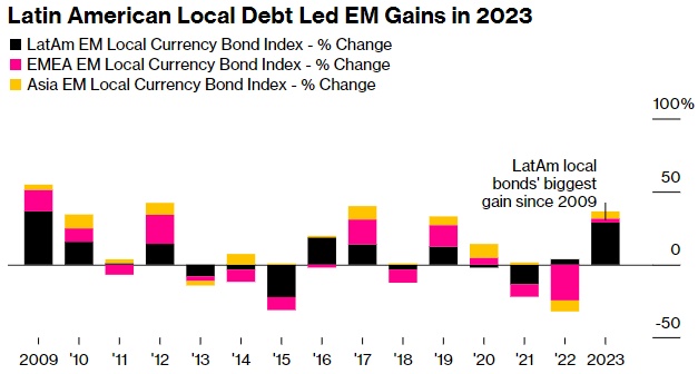如果最终的货币政策转向伴随着美元的贬值,新兴市场的央行官员就不太可能冒着本币贬值的风险,进而将降息。对于交易员来说,这种情况为他们提供了一个独特的机会。正如Anezka Christovova等摩根大通策略师所认为的那样,通胀正在下降,今年上半年经济增长应会保持弹性。他们在1月19日的一份报告中写道,随着美联储越来越接近降息,尽管新兴市场资产在2024年初出现下滑,但这使得当地债券的情况完好无损。