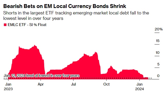 数据显示,即便是最资深的华尔街空头也在押注新兴市场债券走强,将对新兴市场本币基金的空头押注降至四年多来的最低水平。根据S3 Partners的数据,跟踪新兴市场债务的最大ETF——价值30亿美元的VanEck摩根新兴市场本币债券ETF——未平仓的空头头寸降至流通量的0.69%,是2019年10月以来的最低水平。