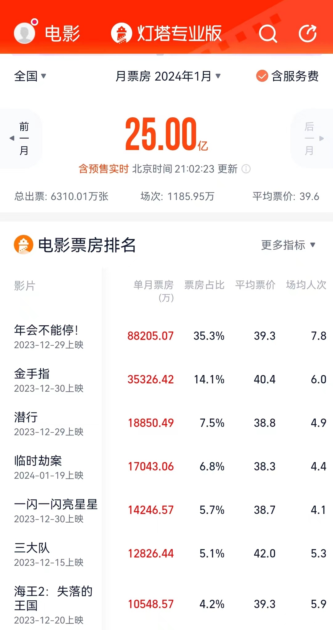 智通财经APP获悉,据灯塔专业版数据,截至1月29日21时02分,2024年1月总票房(含预售)已突破25亿。单月票房排名前三分别为《年会不能停!》(8.82亿)、《金手指》(3.53亿)、《潜行》(1.88亿)。