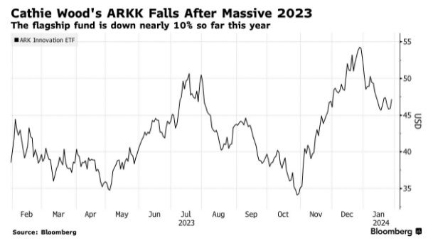 本月迄今为止,特斯拉已下跌25%,原因是汽车行业警告称,电动汽车需求将大幅下降,华尔街分析师也下调了对该股的预期。伍德的旗舰基金下跌了近10%,但这是在2023年上涨68%之后出现的。