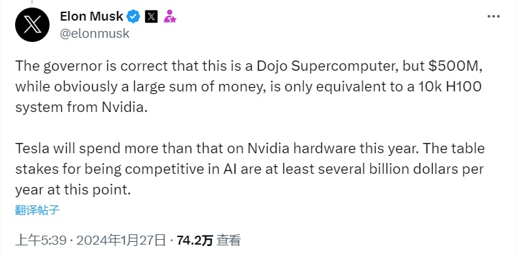 马斯克在社交媒体X(前身为推特)上的一篇帖子中表示:“5亿美元,这个数字显然是一大笔钱,但只相当于1万个基于英伟达H100芯片的人工智能系统。”